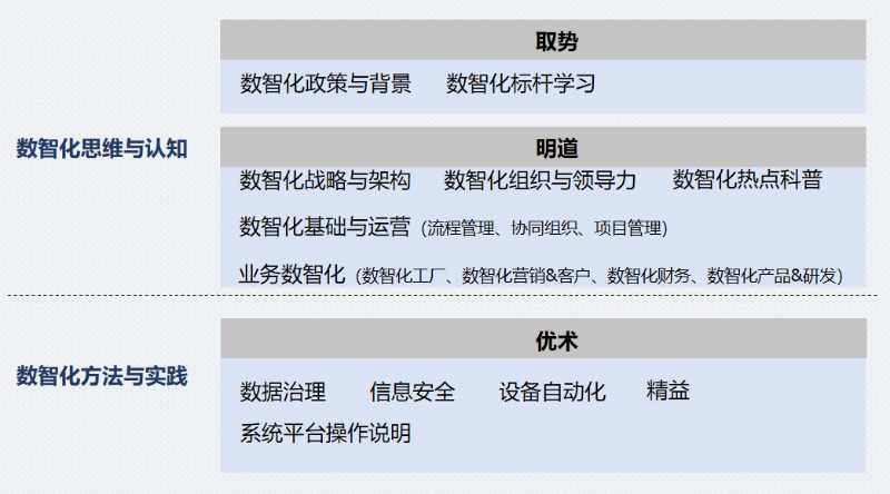 數(shù)智化取勢(shì)項(xiàng)目:了解國(guó)家及行業(yè)發(fā)展態(tài)勢(shì),通過(guò)學(xué)習(xí)標(biāo)桿制造業(yè)數(shù)智化轉(zhuǎn)型案例,與優(yōu)秀企業(yè)對(duì)話,全面對(duì)標(biāo),全面超越。數(shù)智化明道項(xiàng)目:通過(guò)對(duì)遠(yuǎn)東數(shù)智化轉(zhuǎn)型戰(zhàn)略的宣貫與實(shí)踐步驟的分解,對(duì)數(shù)智化轉(zhuǎn)型總體架構(gòu)達(dá)成共識(shí),通過(guò)課程培訓(xùn)給予啟發(fā),加速公司數(shù)智化轉(zhuǎn)型。數(shù)智化優(yōu)術(shù)項(xiàng)目:將垂直行業(yè)知識(shí)與數(shù)智化技術(shù)培養(yǎng)相結(jié)合,為企業(yè)數(shù)智化轉(zhuǎn)型輸送復(fù)合型人才。
